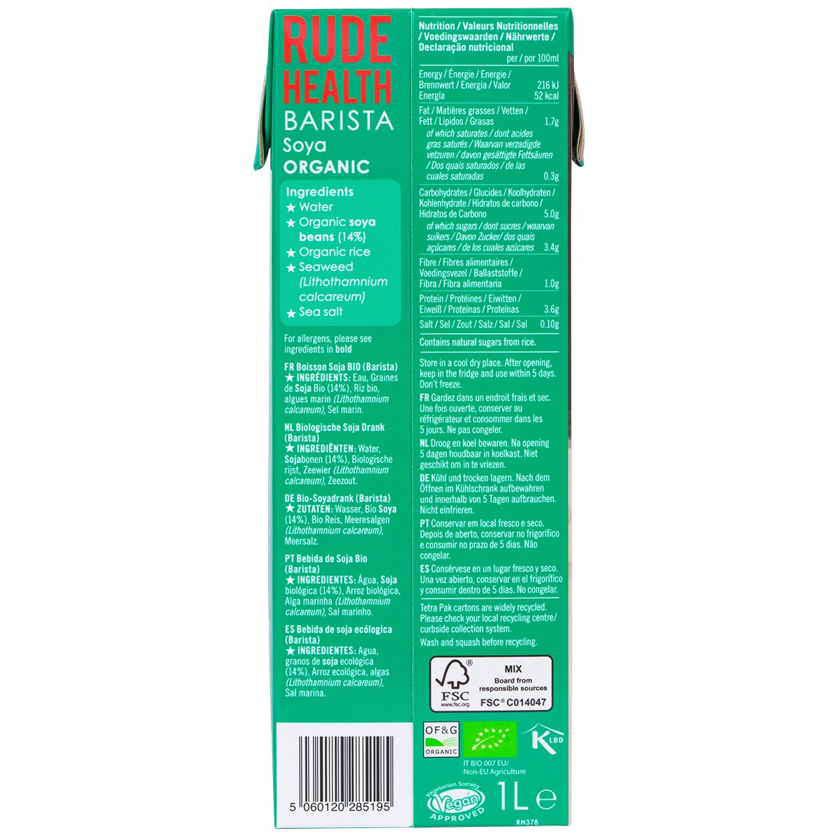 - المكونات: ماء، فول صويا عضوي (14٪)، أرز عضوي، أعشاب بحرية، ملح بحري