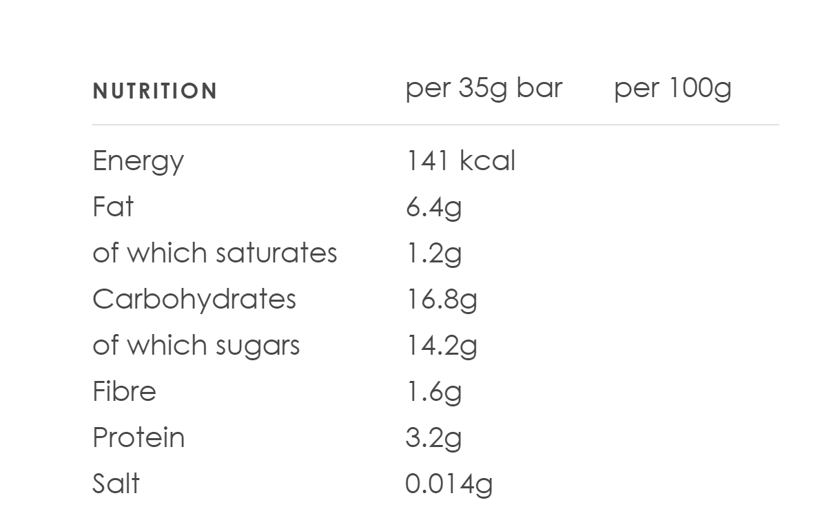 - المكونات: تمر، كاجو، بذور اليقطين (10٪)، تفاح، قرفة (0.8٪)، زنجبيل (0.5٪)