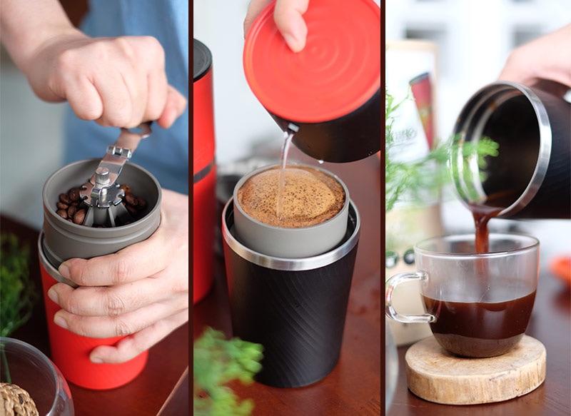 Cafflano introduces the world's first portable pour over coffee brewer with an intuitive epoch-making-all-in-one design. It is an affordable and light weight coffee brewing solution which ensures maximum portability without any hassle of packing. It contains a coffee grinder with foldaway conical burr ceramic hand mill, dripping kettle, dripper; server etched stainless filter and tumbler. All these components are combined to make one assembling unit. You can easily make your fresh hot & cold coffee shot.  It is neither battery-operated nor needs electricity, but totally environment-conscious with its permanent etched stainless filter.