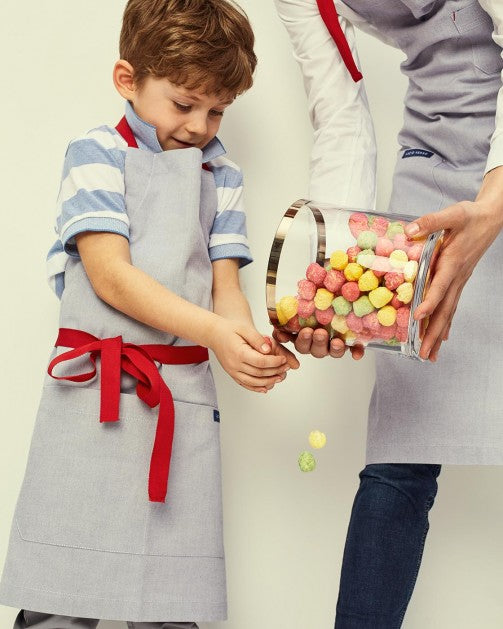 Comfortable and stylish bib apron, with adjustable strap across apron and front pockets.