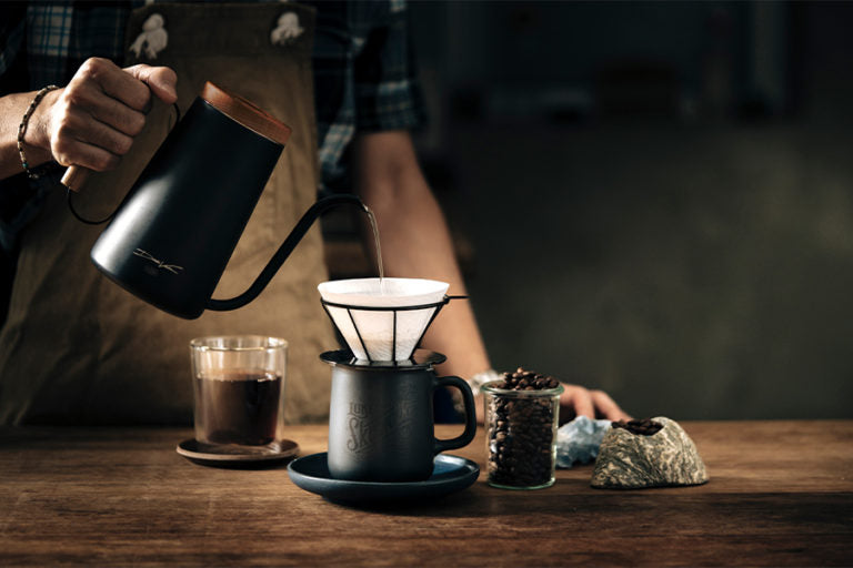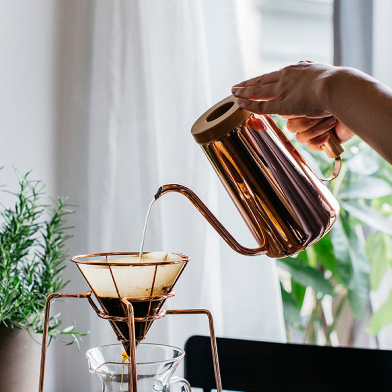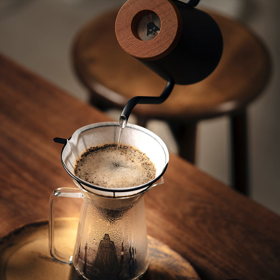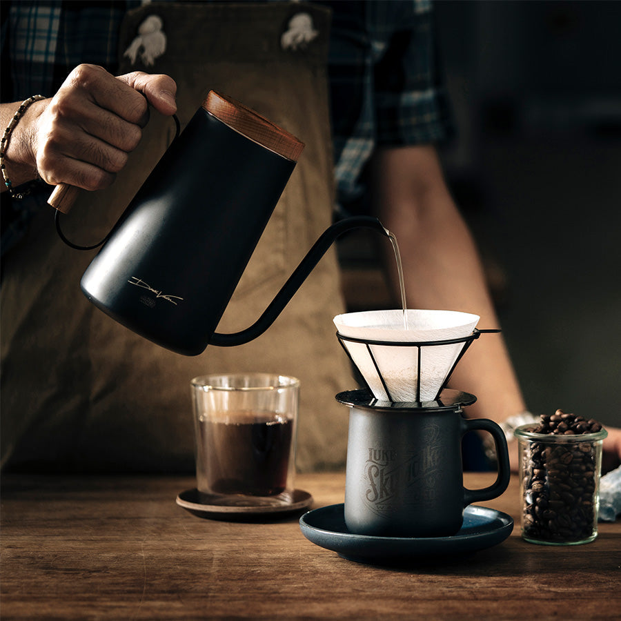 The H.A.N.D kettle is designed for making drip coffee. The thin spout is not only elegant but also enables water to flow slowly and predictably throughout the kettle even with small amount of water. Holding up to 800 ml of water, it meets the needs of both beginners and professional baristas. The angle wooden handle creates warm and stable feeling and the quality black finishing gives the kettle a delightful and eye-catching look.