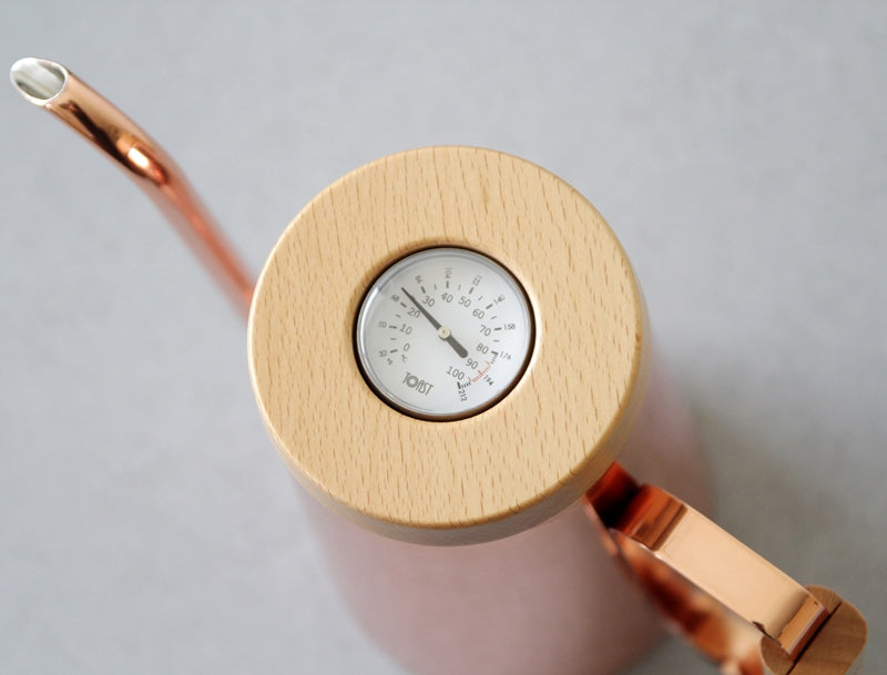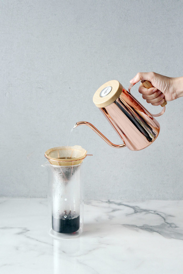 The H.A.N.D kettle is designed for making drip coffee. The thin spout is not only elegant but also enables water to flow slowly and predictably throughout the kettle even with small amount of water. Holding up to 800ml of water, it meets the needs of both beginners and professional baristas. The angle wooden handle creates warm and stable feeling and the quality copper finishing gives the kettle a delightful and eye-catching look.